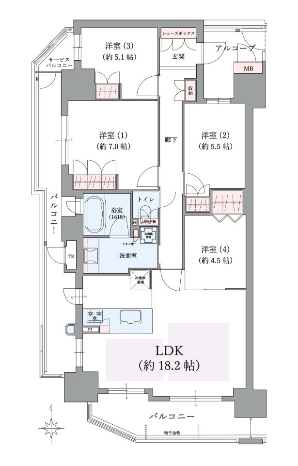 | 間取内訳 | LDK 18.2帖/ 洋室7.0帖・5.5帖・5.1帖・4.5帖 |