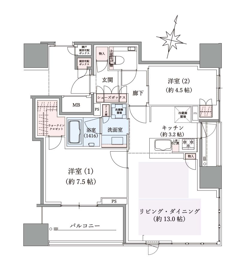 | 間取内訳 | LDK 16.2帖/ 洋室7.5帖・4.5帖 |